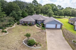 Sweeping golf course views, this beautiful home sits on a cul-de-sac at the #2 Green with view of pond and fairway. Custom built home has a wonderful open floor plan and all rooms are spacious. Notice the attention to detail with beautifully landscaped front and backyards, crown molding, wood flooring, high ceilings, plantation shutters and hand painted accent artwork on dining room ceiling, painted by the owner. Windows across entire living room wall provide lots of natural light and view to golf course. The kitchen is large with granite counters, island, SS appliances plus over and undercabinet lighting. Kitchen is open to a sweet circular breakfast nook with golf views. There is also a formal dining room open to living offering a wonderful space for entertaining. The primary suite is huge with an adjacent office and private exit to back deck. Ensuite bath has separate vanities, built-in dressers, walk-in closet, tub plus walk-in shower. This home is impeccable, tastefully decorated and ready for your move-in. Fridge, washer and dryer convey. Most furnishings negotiable. Holly Lake Ranch is a gated community with 24-7 onsite security, lakes for fishing and watersports, 18-hole golf course, 8 pickleball courts, 3 tennis courts, fitness center, walking trails and much more.
