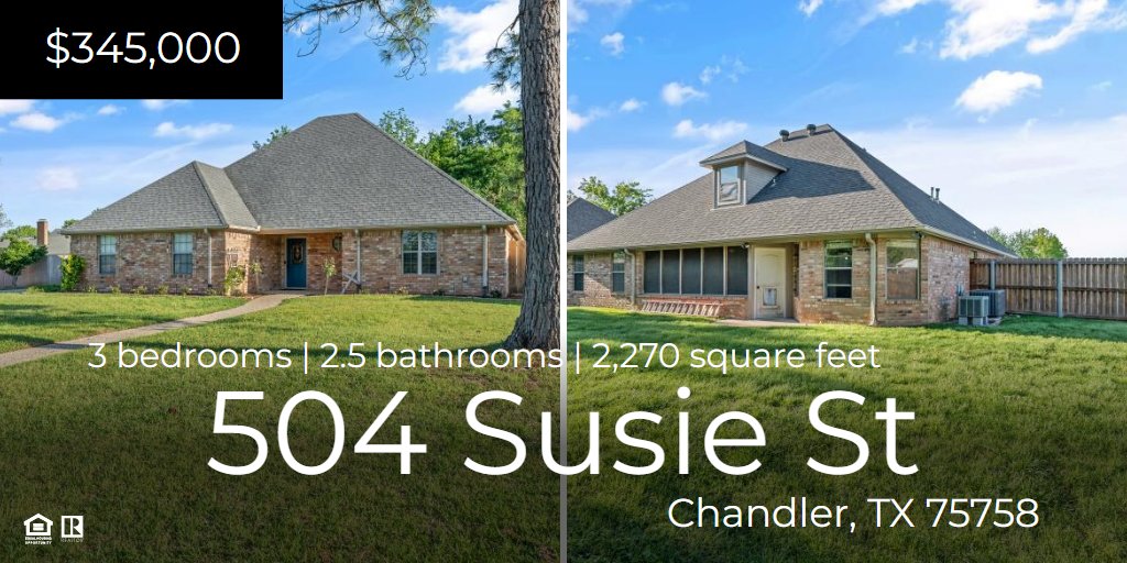 Welcome home to the heart of Chandler! This charming and spacious 3 bedroom, 2.5 bath home offers a unique split floor plan and is located on a spacious lot in North Creek Estates. 504 Susie welcomes you with a formal entryway that invites you into the spacious living room, centered on a wood burning fireplace. This property features vinyl plank floors throughout the downstairs, a spacious kitchen equipped with *NEW* stainless steel appliances, *NEW* carpet upstairs, and LOTS of storage. The generous primary bedroom offers an en suite bath that includes a soaking tub, separate shower, double vanities, and two walk-in closets. The large upstairs bedroom offers a half bath, two large closets, and great flexibility with potential uses as a bonus room, additional living space, or a children's playroom. An inviting screened-in back porch overlooks a large, privacy fenced backyard with plenty of room for a garden, a pool, a playground, a chicken coop, or whatever your heart desires! Fresh landscaping and a sprinkler system make for a beautiful, yet easily maintained, yard. Whether you enjoy reading at the library, kayaking and fishing, catching an evening ballgame, a walk in the park, disc golf, or shopping and eating local, Chandler, Texas, has it all, and offers convenient access to Athens and Tyler. Don't miss your opportunity to own a dynamic home in the heart of this quaint East Texas town.